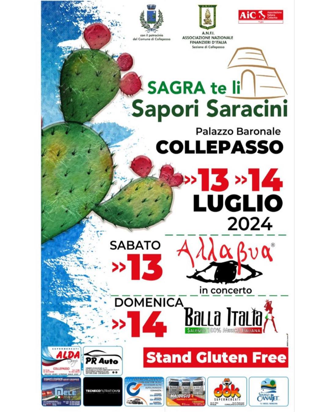Il 13 e 14 luglio 2024 a Collepasso (Le) presso nell’area antistante del Palazzo Baronale, si svolgerà la “Sagra Saracina”. Si potranno degustare prodotti tipici locali.