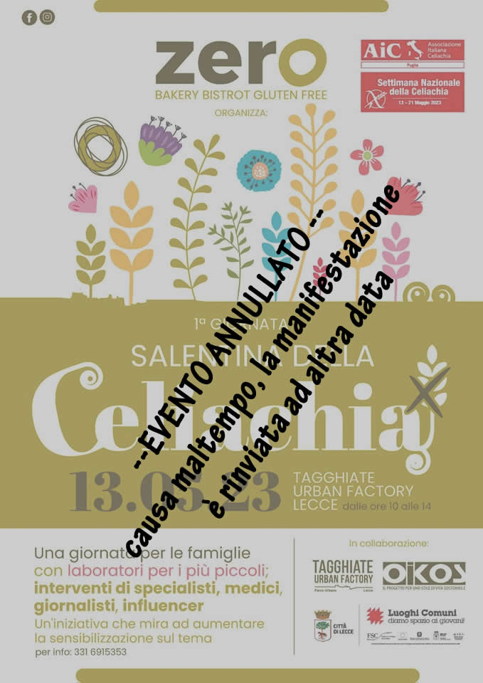 L’evento di domani 13 maggio a Lecce inerente alla giornata di sensibilizzazione sul tema celiachia è stato annullato causa maltempo.