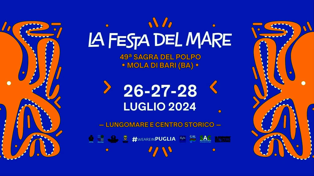 Festa del Mare a Mola di Bari con la 49esima Sagra del Polpo, braci accese e concerti sul lungomare e nel centro storico. Alla manifestazione sarà presente una postazione dedicata ai celiaci, a cura di Il Pirata Gourmet, dove si potranno degustare panini senza glutine farciti con il polpo.