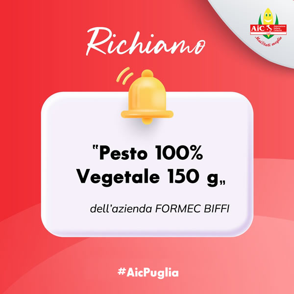 Vi informiamo che sono state attivate le procedure di richiamo dal mercato del prodotto “Pesto 100% Vegetale 150 g” dell’azienda FORMEC BIFFI.