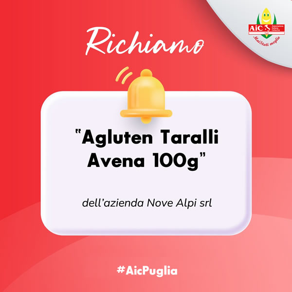 Vi informiamo che sono state attivate le procedure di richiamo dal mercato del prodotto “Agluten Taralli Avena 100g” dell’azienda Nove Alpi srl