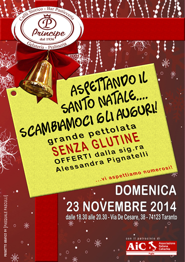 Domenica 23 Novembre 2014 dalle ore 18:30 alle ore 20:30 si terrà presso il Caffè Storico – Bar Pasticceria Principe sito in Via de Cesare, 38 a Taranto una GRANDE PETTOLATA senza glutine, offerta dalla sig.a Alessandra Pignatelli.