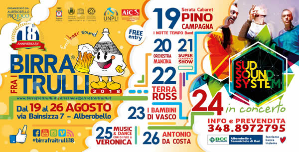 Ad Alberobello (Ba) in via Bainsizza, dal 19 al 26 agosto, è in programma la 18a Edizione della Birra tra i Trulli. Divertimento, musica, gastronomia locale e tanta….birra. AIC Puglia ha dato il suo patrocinio alla manifestazione e, per i celiaci, ci sarà uno stand dedicato dove poter gustare delle pizze e fresche birre senza glutine. Vi aspettiamo.
