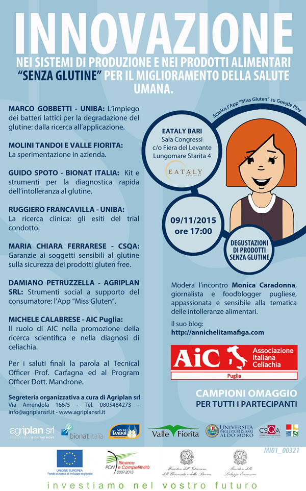 Bari 9 novembre 2015 – Convegno “Innovazione nei sistemi di produzione e nei prodotti alimentari senza glutine per il miglioramento della salute umana”