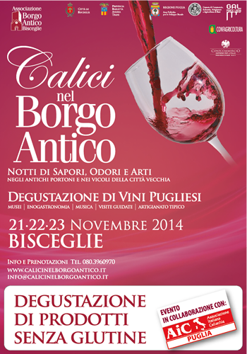 Nei giorni 21, 22 e 23 novembre prossimi si terrà a Bisceglie la manifestazione CALICI NEL BORGO ANTICO, degustazione di vini nei portoni e nelle vie del centro storico.