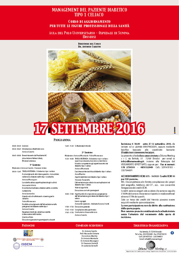 Brindisi 17 settembre 2016 – “Management del paziente diabetico tipo 1 celiaco”