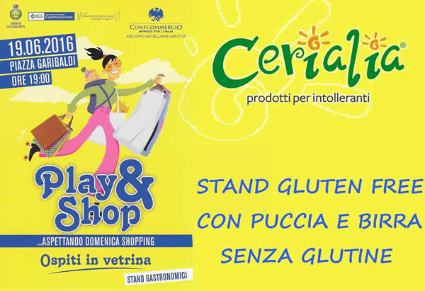 Domenica 19 giugno, dalle ore 19,00, in Piazza Garibaldi,  “Play e Shop” . Sarà presente uno Stand gastronomico, curato dal personale del negozio Cerialia di Castellana Grotte. Si prepareranno pucce senza glutine, farcite in vari modi, accompagnate da birra senza glutine.