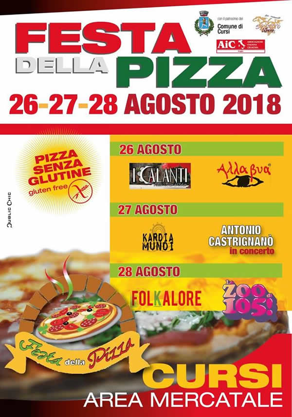 A Cursi (Le), nell’area mercatale, nei giorni 26-27-28 agosto 2018, si svolgerà la “Festa della Pizza“, evento musicale ma soprattutto enogastronomico con diverse prelibatezze e piatti tipici, ma soprattutto numerosissime varietà di pizza tra cui la pizza senza glutine. Con il patrocinio di AIC Puglia, sarà allestito stand dedicato per la degustazione di pizze gluten free. Vi aspettiamo