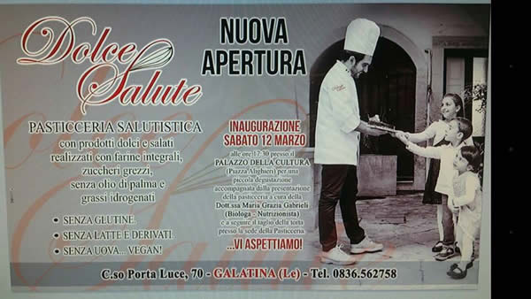 Sabato 12 marzo, alle ore 17,30, a Galatina (LE) – C.so Porta Luce, 70, sarà inaugurata una nuova Pasticceria salutistica gluten freeDolce Salute”.