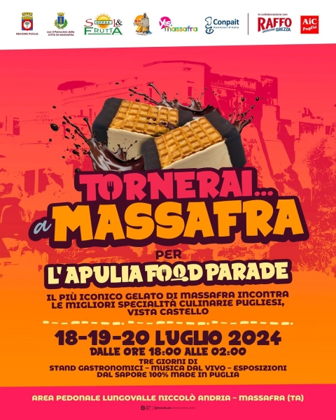 Dal 18 al 20 luglio, dalle ore 18.00, presso il nuovo Lungovalle Niccolò Andria di Massafra (Ta), nell’ambito della Sagra del Tornerai (noto gelato locale), saranno ospitati stand gastronomici con musica dal vivo ed esposizioni.