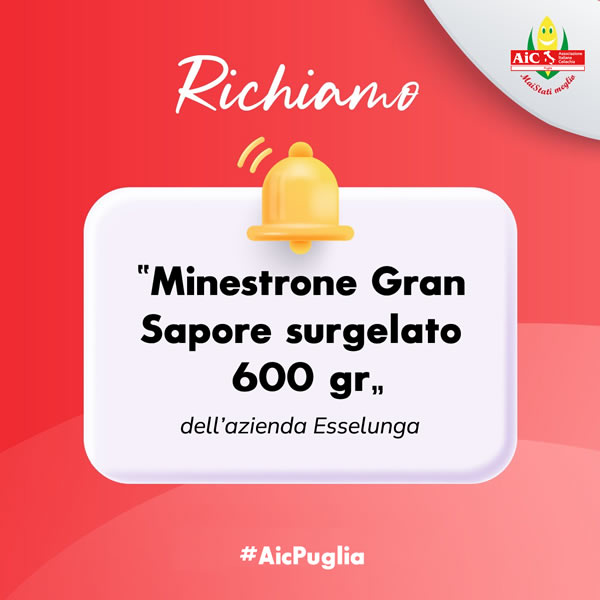 Vi informiamo che sono state attivate le procedure di richiamo dal mercato del prodotto “Minestrone Gran Sapore surgelato 600 gr” dell’azienda ESSELUNGA per presenza di glutine non dichiarato in etichetta.